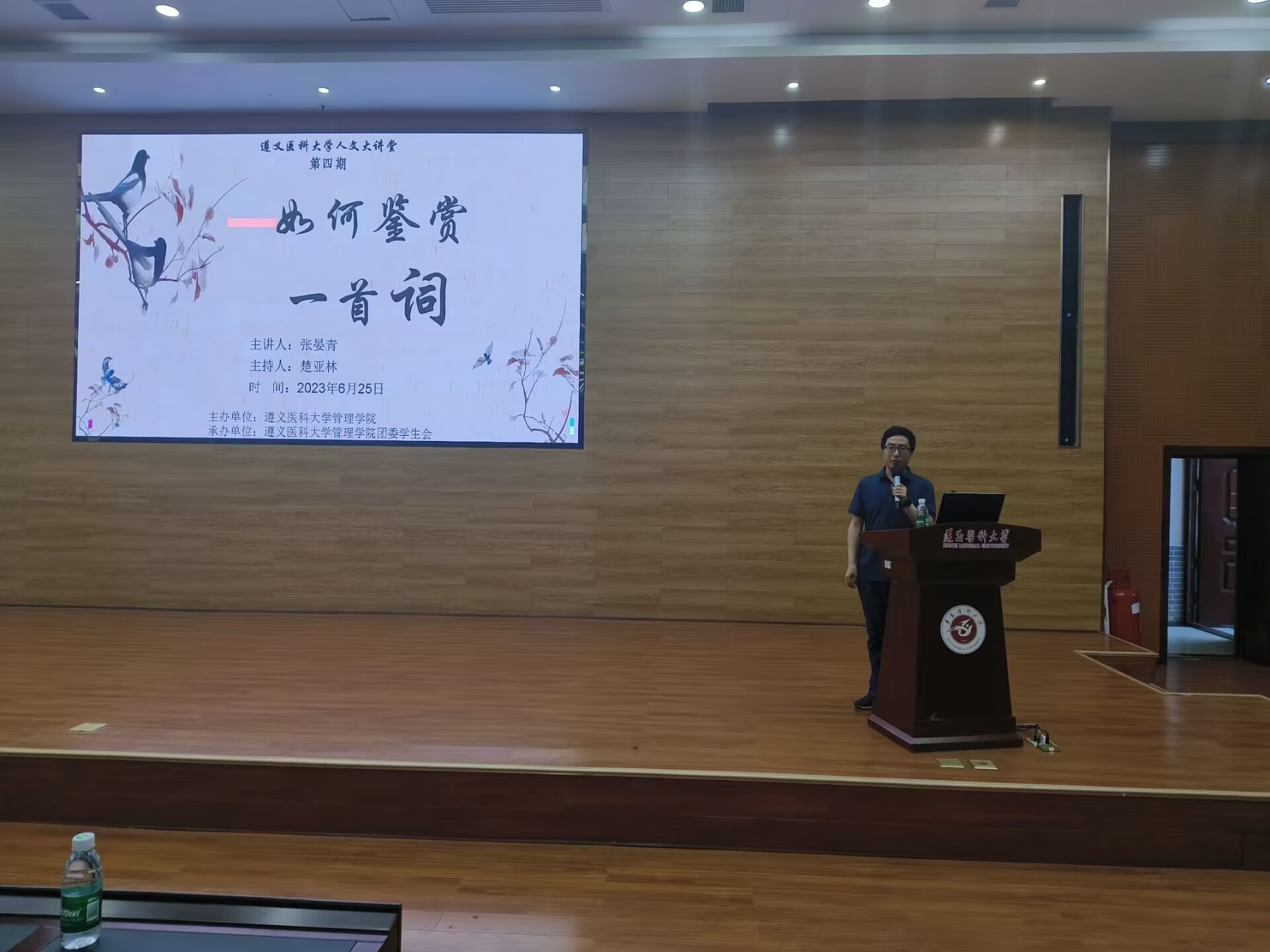 为弘扬中华民族优秀传统文化,普及中国古代文学知识与其蕴含的人文精神,加强员工对词的理解,提高员工对词的品鉴能力,进一步开拓员工的胸襟与眼界,PA视讯平台于2023年6月25日晚上7点在人文楼道德讲堂开展了“人文大讲堂”主题系列讲座第四期——《如何鉴赏一首词》。本次讲座由PA视讯主办,PA视讯团委员工会承办,公共基础教研室副主任张晏青老师主讲,应用心理学教研室主任朱千教授主持。