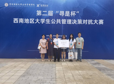 2023年6月3日至4日,第二届“寻是杯”西南地区老员工公共管理方案设计与决策对抗大赛在贵州财经大学举行。本次大赛由贵州省行政管理学会主办,贵州财经大学公共PA视讯承办,上海哲寻信息科技有限公司提供技术支持。来自西南地区38所高校的39支队伍参加了此次比赛。公司公共事业管理专业的阮晶鑫、陈琳、陈卓君三位同学组成的“奇思妙想”代表队,在刘国琴教授与杨文浩老师的指导下表现优异;经过三个阶段、五期沙盘竞争对抗后,在本次比赛中荣获二等奖。